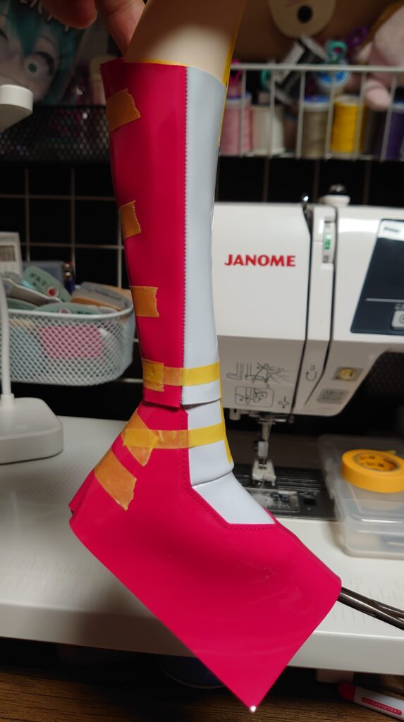 この後ヒールも同じように生地を付け接着、そのほかの部員もつけ靴は完了になります。